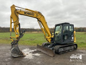 5 Kobelco SK85 CS excavator, hydraulic quick coupler, cab, heat, AC, 8ft back fill blade, 36 inch digging bucket, hydraulic thumb, rubber tracks, 1,775 hours, SN LF09-08117