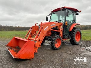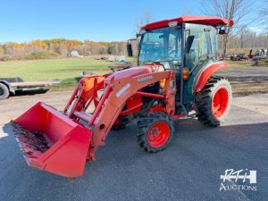 3 2016 Kubota L3560 tractor, 4WD, cab, heat, AC, quick connect loader, universal coupler, GP bucket, 2 remotes, 224 hours.
