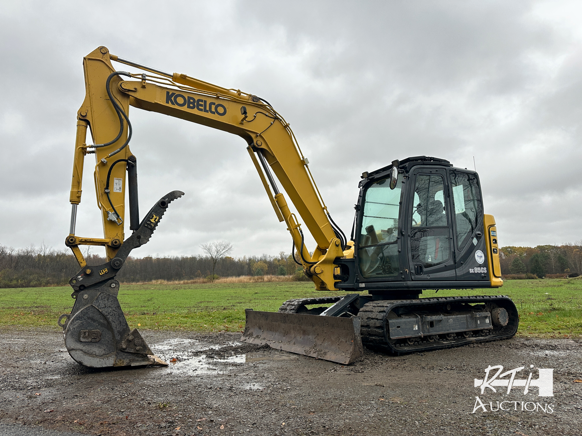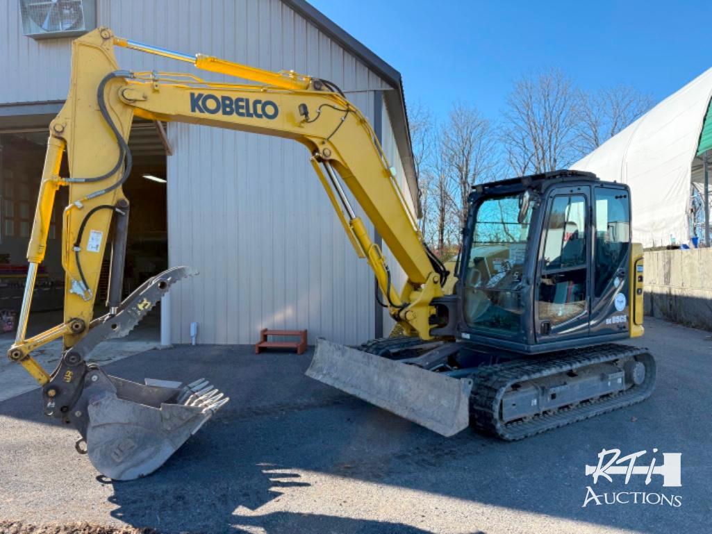 5 Kobelco SK85 CS excavator, hydraulic quick coupler, cab, heat, AC, 8ft back fill blade, 36 inch digging bucket, hydraulic thumb, rubber tracks, 1,775 hours, SN LF09-08117