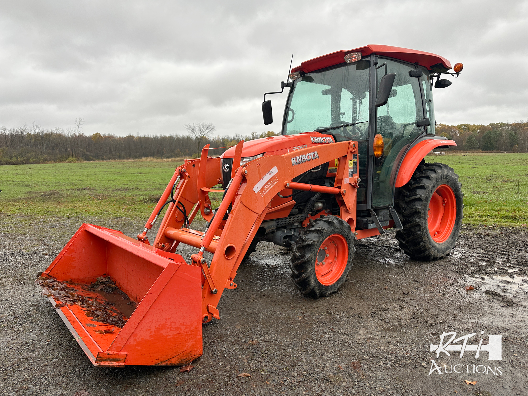 3 2016 Kubota L3560 tractor, 4WD, cab, heat, AC, quick connect loader, universal coupler, GP bucket, 2 remotes, 224 hours.